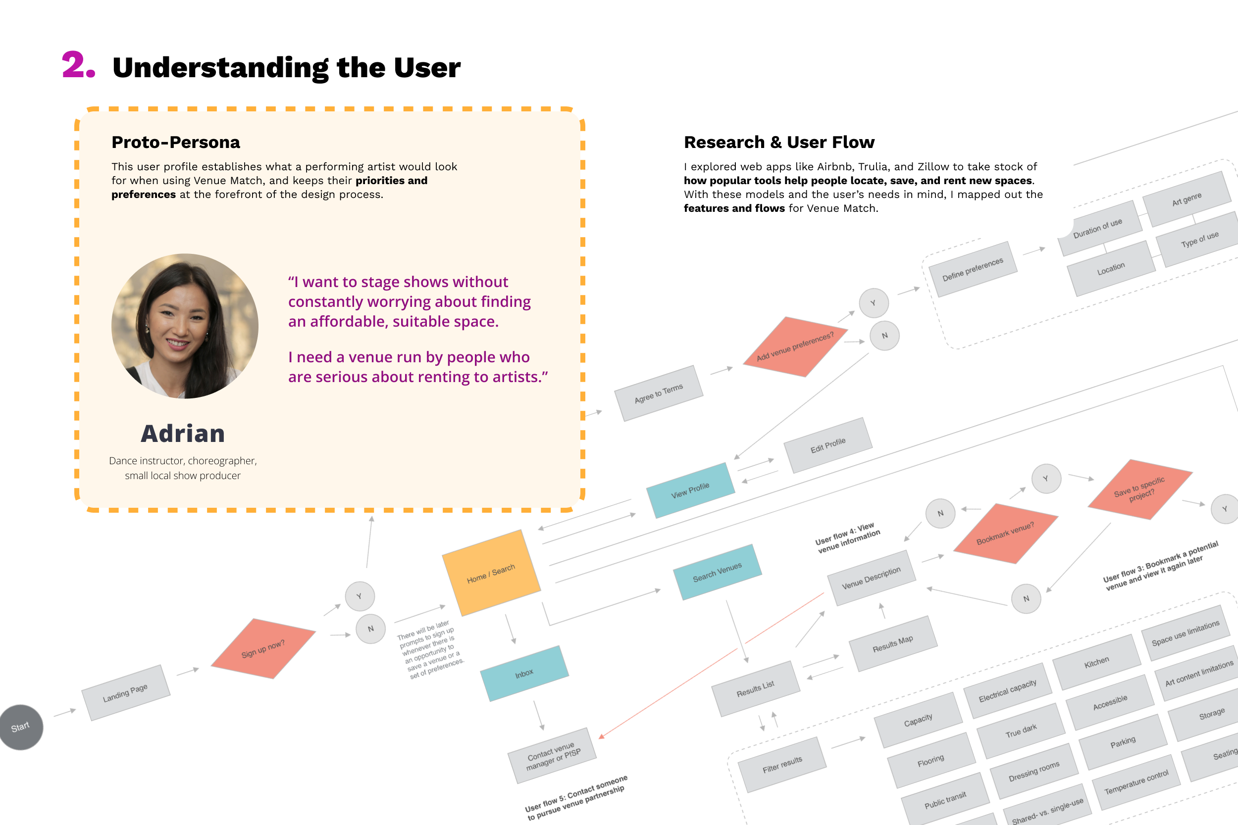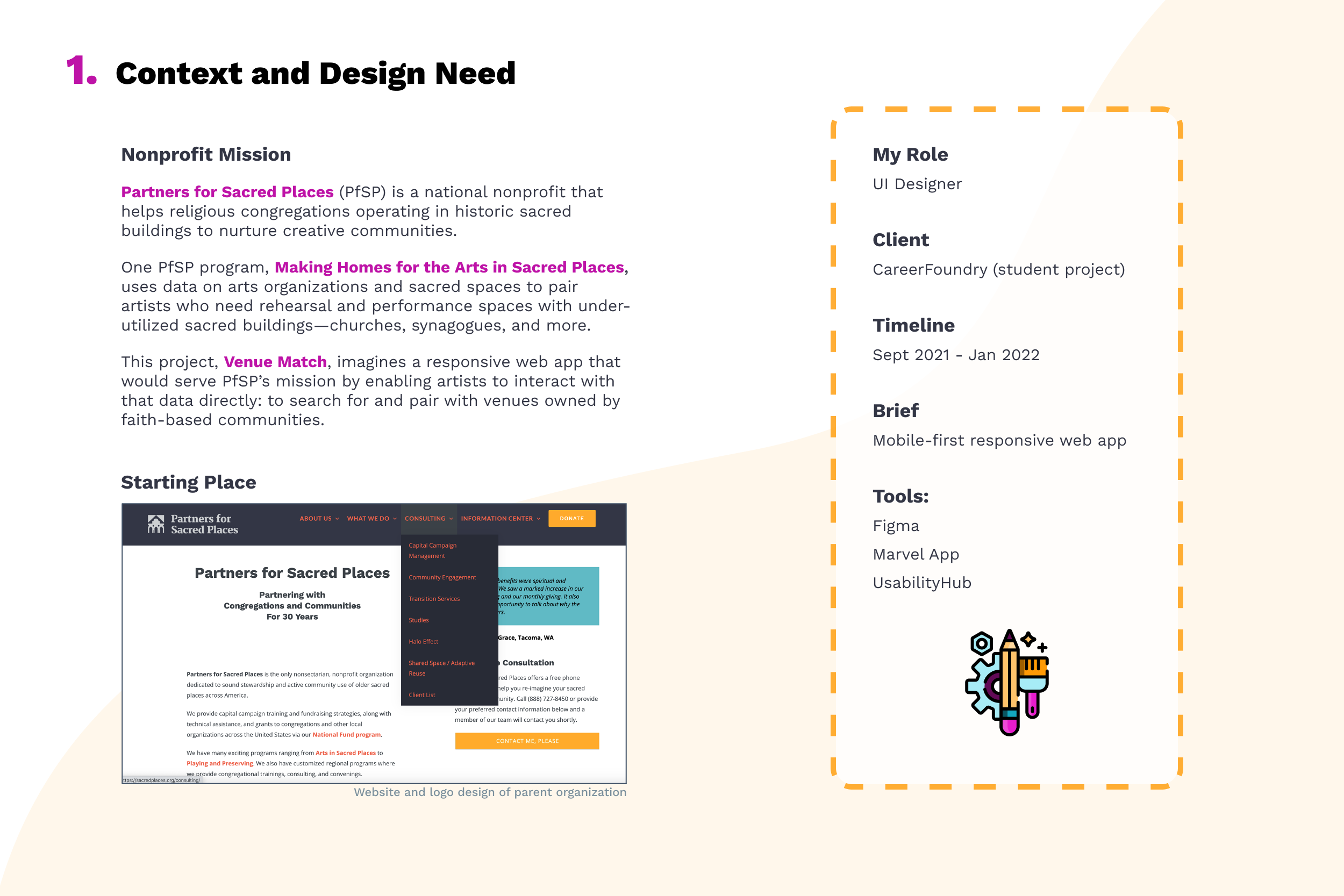 A responsive, mobile-first web app to suit the business and branding needs of national nonprofit Partners for Sacred Places. Venue Match adapts UI design patterns from the real estate and travel sectors to help performing artists match with unique venues and to launch ongoing partnerships with sacred spaces.